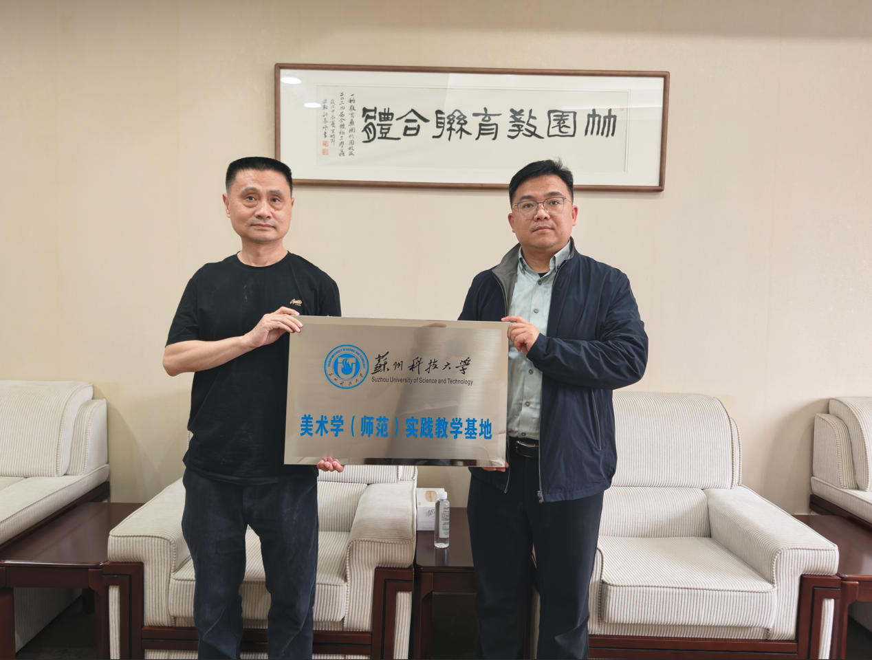 为深化高校与基础教育协同育人,推动美术学(师范)专业实践教学与中学美育深度融合,近日,苏州科技大学艺术学院与苏州高新区第一初级中学教育集团举行合作共建签约暨揭牌仪式。苏州高新区第一初级中学教育集团党委书记倪凯健,苏州科技大学艺术学院副院长狄野,美术系主任朱骏益、骨干教师叶彬等出席活动。