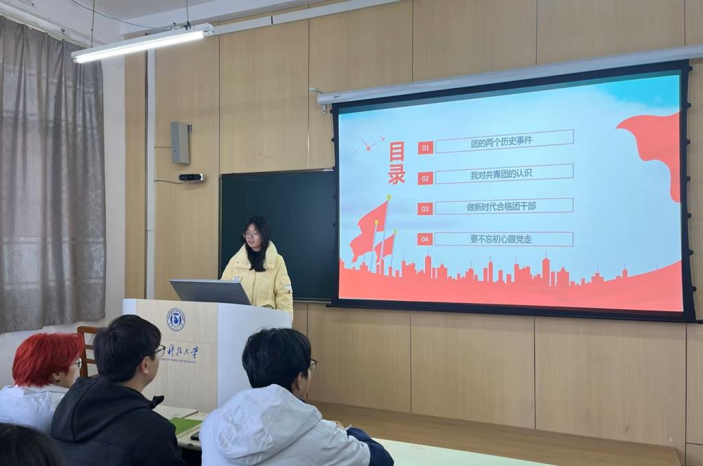活动开始,主讲人以青年为引,引用习近平总书记的话强调了青年的重要性。主讲人指出,青年是国家发展的重要体现,是民族复兴的重要力量。这也从侧面体现出团干部的重要性,团干部应带动身边的同学共同进步,积极参与班级建设和校园文化建设,营造良好的学习氛围和校园环境。为深入学习贯彻习近平总书记关于高校思想政治工作和青年工作的重要思想,主讲人讲解了几个关于团的历史故事,让我们回望历史,了解了青年团的光辉历程,重走前辈们的奋斗足迹,培养团干部的社会责任感和历史使命感,让大家更加坚定自己的信念,为实现中华民族伟大的中国梦贡献青春力量。交流互动环节,大家齐聚一堂,团干部们分享各自的经验困惑。不同的观点在这里交汇,创新的火花在这里迸发。主讲人强调团干部要在学习、工作、生活等各方面严格要求自己,以身作则,为同学们树立榜样。