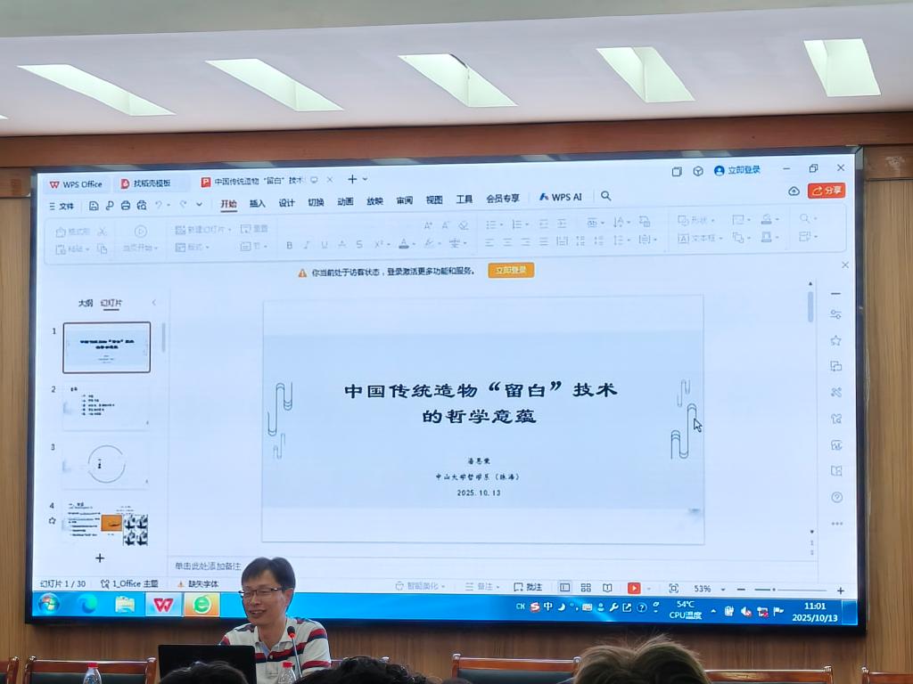 10月13日,苏州科技大学艺术学院诚邀中山大学(珠海)哲学系教授潘恩荣,于江枫校区艺术报告厅开展了一场主题为“中国传统造物‘留白’技术的哲学意蕴—生成式人工智能背景的技术知识论探索进路”的学术报告。本次活动由我校艺术学院院长莫军华教授主持,学科带头人薛娟教授、视觉传达设计方向负责人朱永明教授、杨新华博士、张毅博士、孙少华博士参与了讨论。
