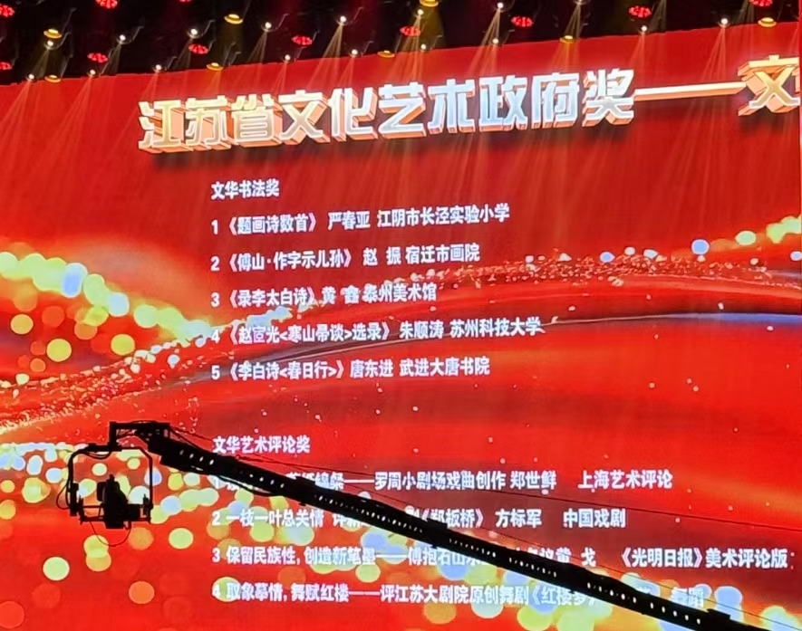 据悉, 江苏省文华奖是经省人民政府批准设立的省级专业艺术领域政府最高奖项,旨在表彰在艺术创作和表演方面取得突出成就的单位和个人,代表我省艺术创作的最高水平。奖项涵盖戏剧、音乐、舞蹈、美术、书法(含篆刻)、摄影、曲艺、杂技、民间文艺、艺术理论评论等多个专业类别,全面覆盖舞台艺术与视觉艺术、创作实践与理论研究等艺术领域。今年共评选出获奖作品及个人125项,其中书法领域全省仅有5位作者获文华奖。